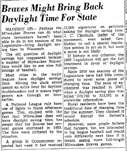 - 03/29/1954: Sheboygan Press: "Braves Might Bring Back Daylight Time For State" Anybody that doubts how important the Braves were to Milwaukee needs to read this article. Forget the legislature, we need an extra hour for Braves baseball!!! (Crazy thing is we have daylight savings in Wisconsin now:))