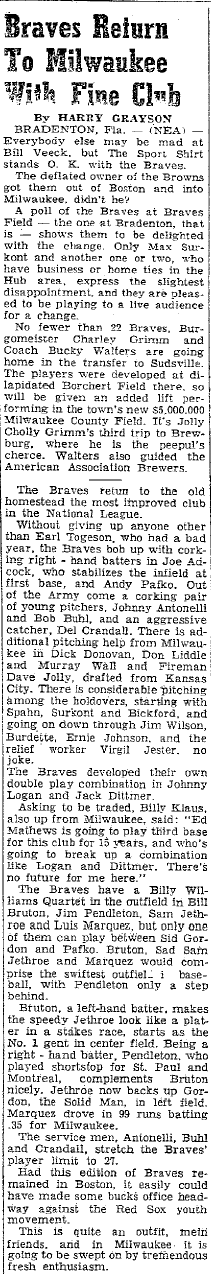- 03/31/1953: Panama City News: "Braves Return to Milwaukee with Fine Club" This is a great article about the brand new Milwaukee Braves breaking camp in Bradenton, Florida and headed to Milwaukee for the first time.
