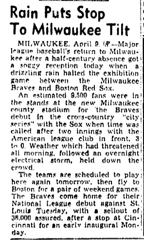 - 04/10/1953: Syracuse Post Standard: "Rain Puts Stop to Milwaukee Tilt" Information on the Braves exhibition game, the first in County Stadium, 2 innings long.