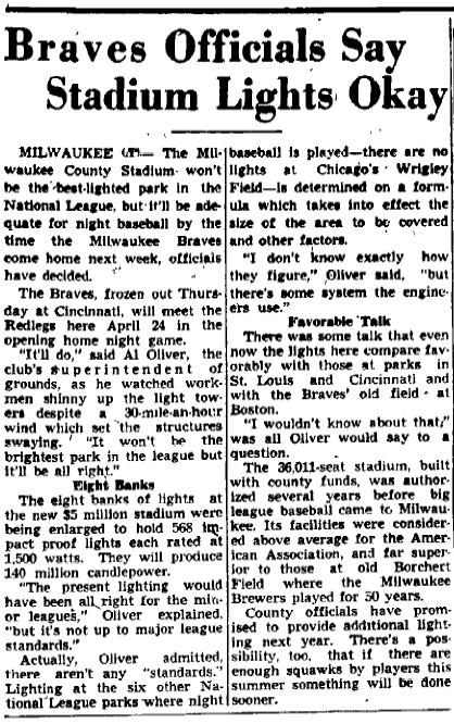 - 04/18/1953: Sheboygan Press: "Braves Officials Say Stadium Lights Okay" Article about County Stadium trying to get ready for the arrival of the Braves and making sure there are enough lights for a night game.