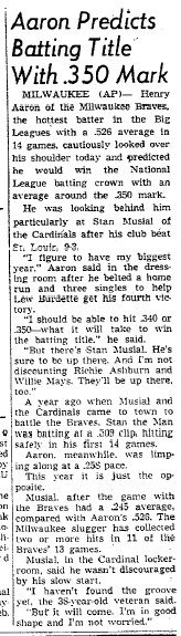- 04/30/1959: Stevens Point Daily Journal: "Aaron Predicts Batting Title With .350 Mark" Seems prophetic in hind sight as he won the title in 1959 with a .355 average.