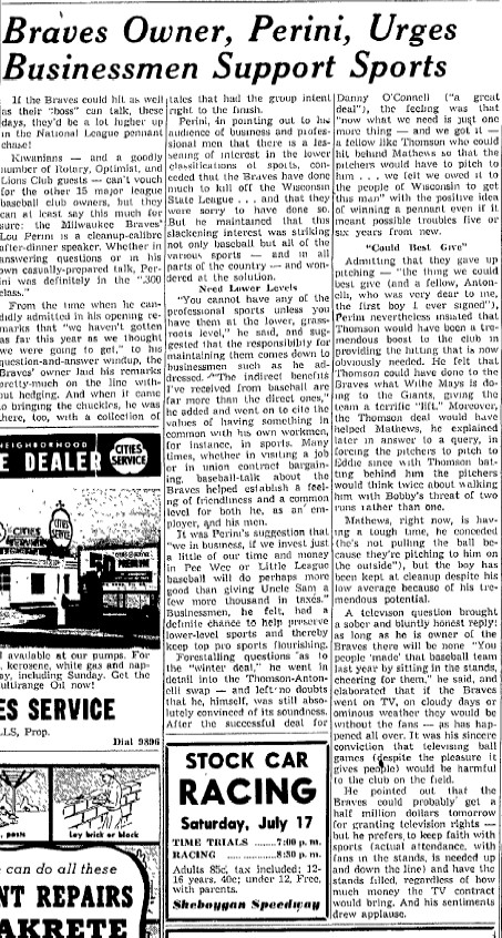 - 07/16/1954: Sheboygan Press: "Braves Owner, Perini, Urges Businessmen Support Sports" Great article about grass roots support.