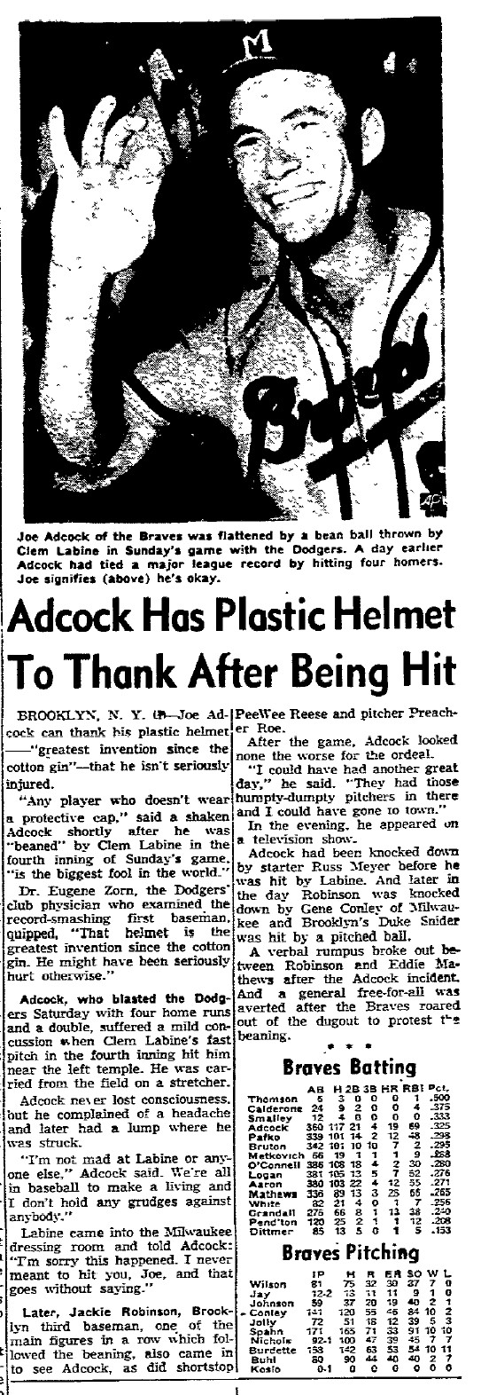 - 08/02/1954: Waukesha Daily Freeman: "Adcock Has Plastic Helmet To Thank After Being Hit" A day after hitting four home runs, plastic helmet the greatest invention since the cottin gin.