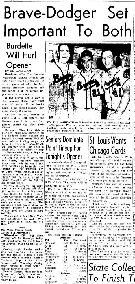 - 09/10/1954: Stevens Point Daily Journal: "Brave-Dodger Set Important to Both" and "Is Everybody Happy About the Braves in Milwaukee"Two great articles from the same paper. The second article is a great insight into how powerful of a draw the Braves were.