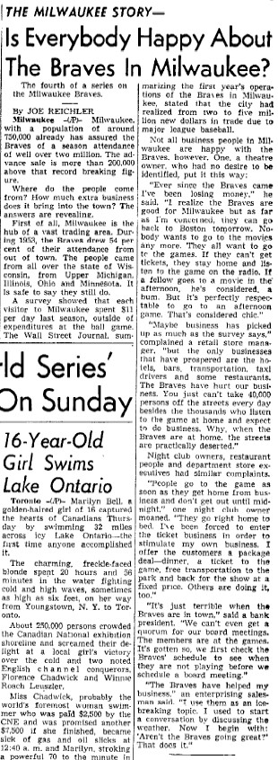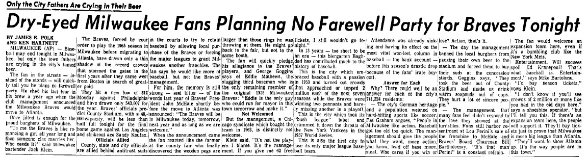 - 09/22/1965: Appleton Post Crescent: "Dry Eyed Milwaukee Fans Planning No Farewell Party For Braves Tonight" An interesting article into the dragged out move out of Milwaukee and how the jilted fans felt.