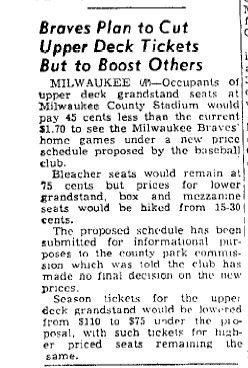 - 09/13/1954: Oshkosh Northwestern: "Braves Plan to Cut Upper Deck Tickets But to Boost Others" Hold on tight, bleacher seats are..... 75 cents.