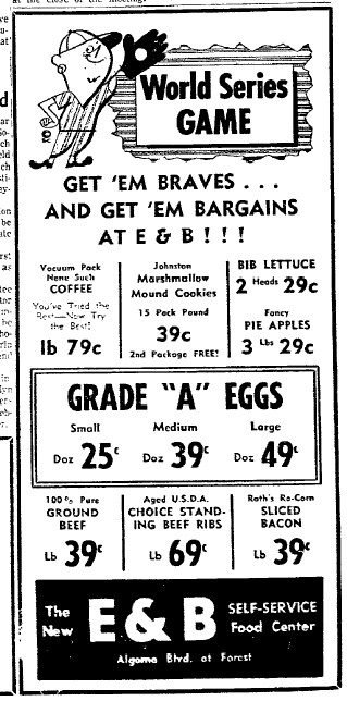- 09/19/1956: Oshkosh Northwestern: "Get Em Braves and Get Em Bargains" Great vintage ad for grocery store.