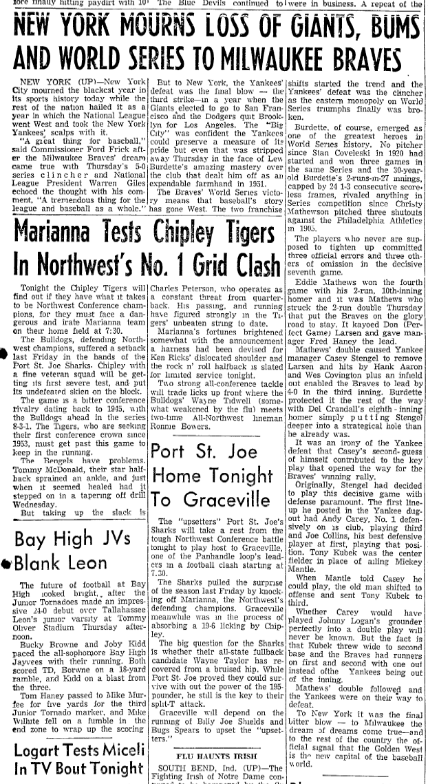- 10/11/1957: Panama City Herald: "New York Mourns Loss of Giants, Bums and World Series to Milwaukee Braves" An interesting article on the heels of the Yankees loss to the Braves and reflection on the season gone by.