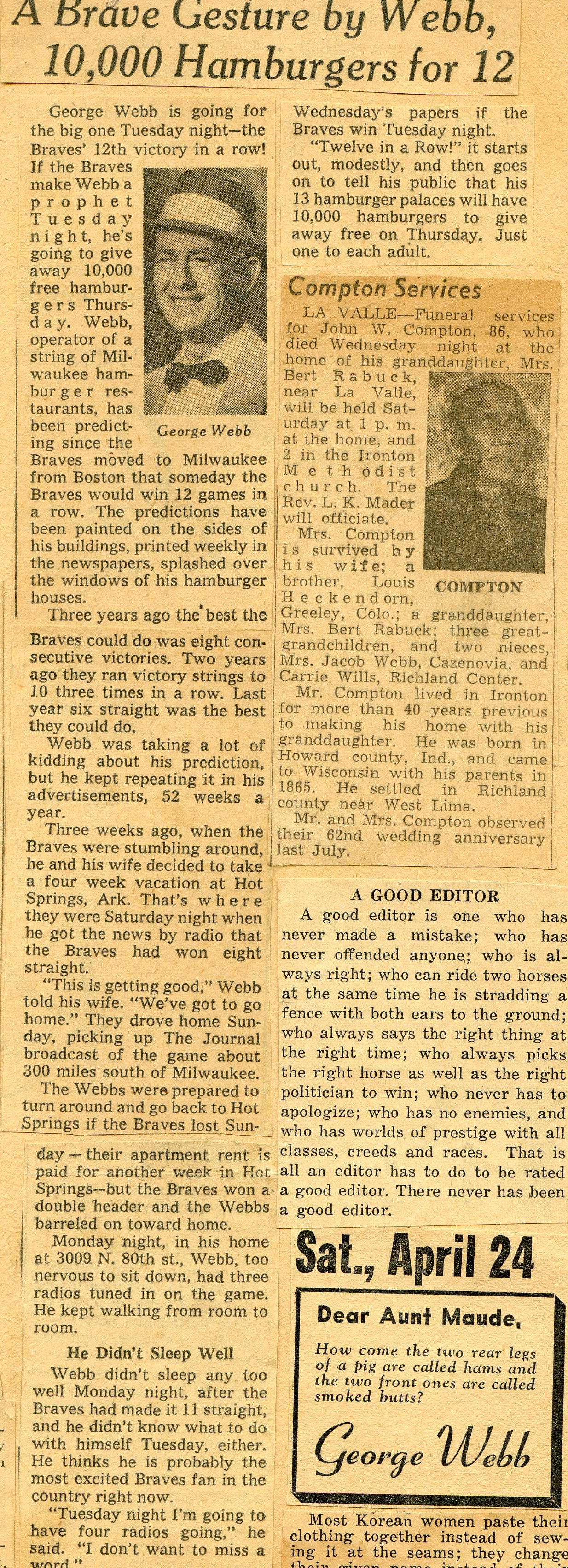 - 06/1956: Milwaukee Journal or Sentinel: "A Brave Gesture by Webb, 10,000 Hamburgers for 12"A great article about George Webb predicting 12 wins in a row and pacing the house listening to the Braves. Thanks Bobby for this article scan.
