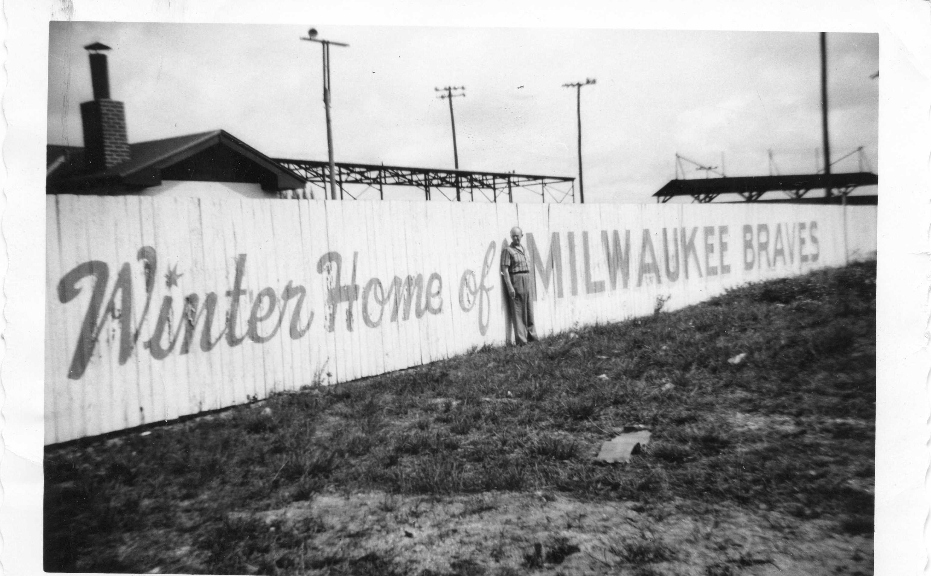 This was in the 1980's, my childhood years. George Webb was founded well before that. George Webb is a Milwaukee based restaurant chain that was founded in 1948 and is still going strong today 60 years later. As the story goes George Webb first started these predictions in the late 1940's. He first predicted that the minor league American Association Milwaukee Brewers would win 17 straight. When the Milwaukee Braves moved from Boston in 1953 the prediction became 11 wins a row. ( a lot of stories say 12 but we have a picture to the right that proves it). During the first few years with the Braves the number changed depending on the quality of the team. Later on this prediction settled in at 12 and remains that way today. This bold prediction was painted on the side of the restaurants and advertised throughout the city. It became a part of Milwaukee's love affair with the Braves.The closest George Webb came to paying out on this prediction with the Braves first came in 1956. With only one more game to go it is rumored George paced his house with radios on wondering if he would be paying out 10,000 free hamburgers (read the entire newspaper article here).Unfortunately the Braves lost to Philadelphia 4-2 and the streak would have to start anew. (On an interesting side note, on April 19, 1987 the Milwaukee Brewers won their 12th straight. Three days later George Webb gave away 168,194 free hamburgers.) In November of 1956, George Webb suffered a heart attack but recovered in time to make his annual road trip to the Braves spring training camp in Bradenton, Florida in February 1957. On the drive home, Webb suffered another heart attack in Cartersville, Georgia, and died on March 12, 1957 at the age of 56. He was survived by his wife Evelyn. The picture below and to the right shows George Webb in 1957 at the Braves training camp. This is one of the last known photos of George Webb.