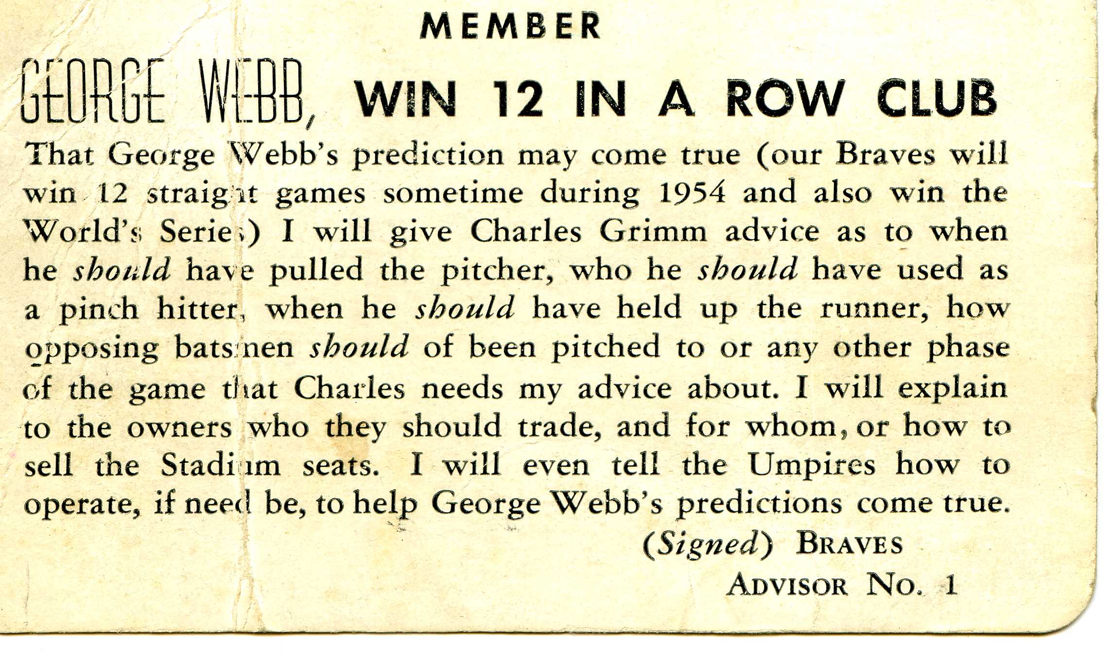 1948-53 Milwaukee Brewers (minor league) 17 1953 Milwaukee Braves 11* 1954 Milwaukee Braves 12* 1955-63 Milwaukee Braves 12 1964 Milwaukee Braves 12* 1965 Milwaukee Braves 12 1966-69 unknown 1970-Present Milwaukee Brewers 12* *These years are confirmed with images of old advertisements. If you can help confirm the other years it would be greatly appreciated. Here are some additional George Webb and Braves related photos. George Webb Club Card